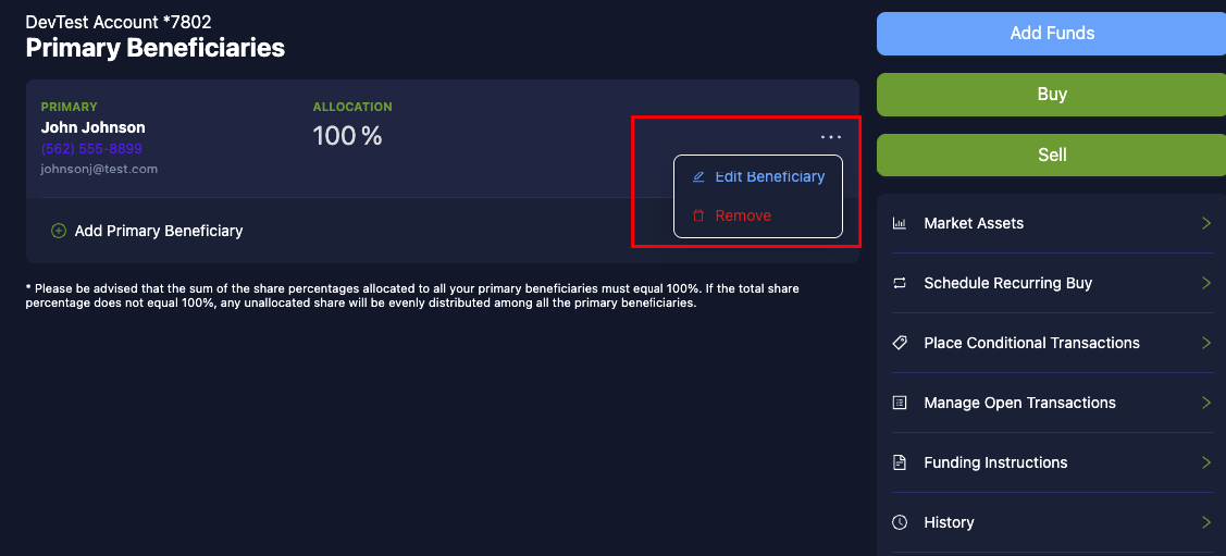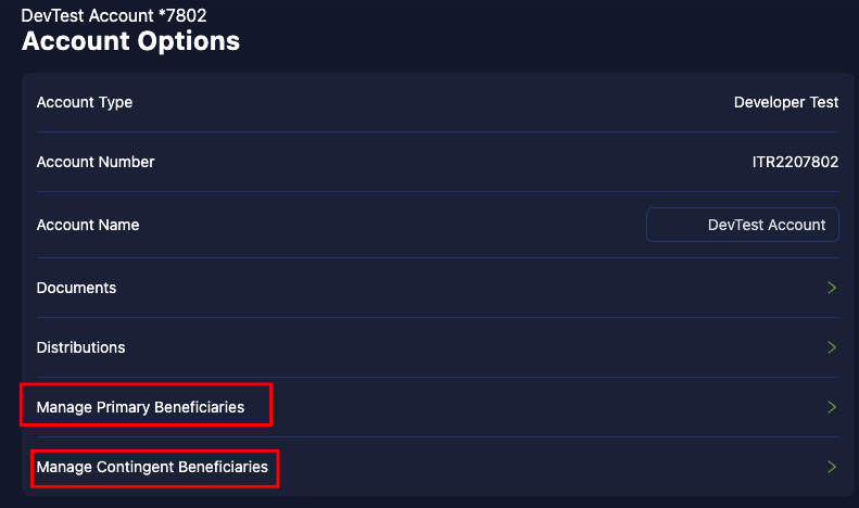 If the Primary or Contingent Beneficiaries designated in your IRA's "Account Options" section is incorrect, please utilize the "Edit Beneficiary" button to make any necessary changes.